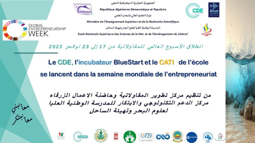 Du 17 au 23 novembre 2025, rejoignez-nous avec le CDE, l’incubateur BlueStart et le CATI de l’ENSSMAL pour une semaine pleine d’ateliers, de formations et d’échanges autour de l’entrepreneuriat et de l’économie bleue !